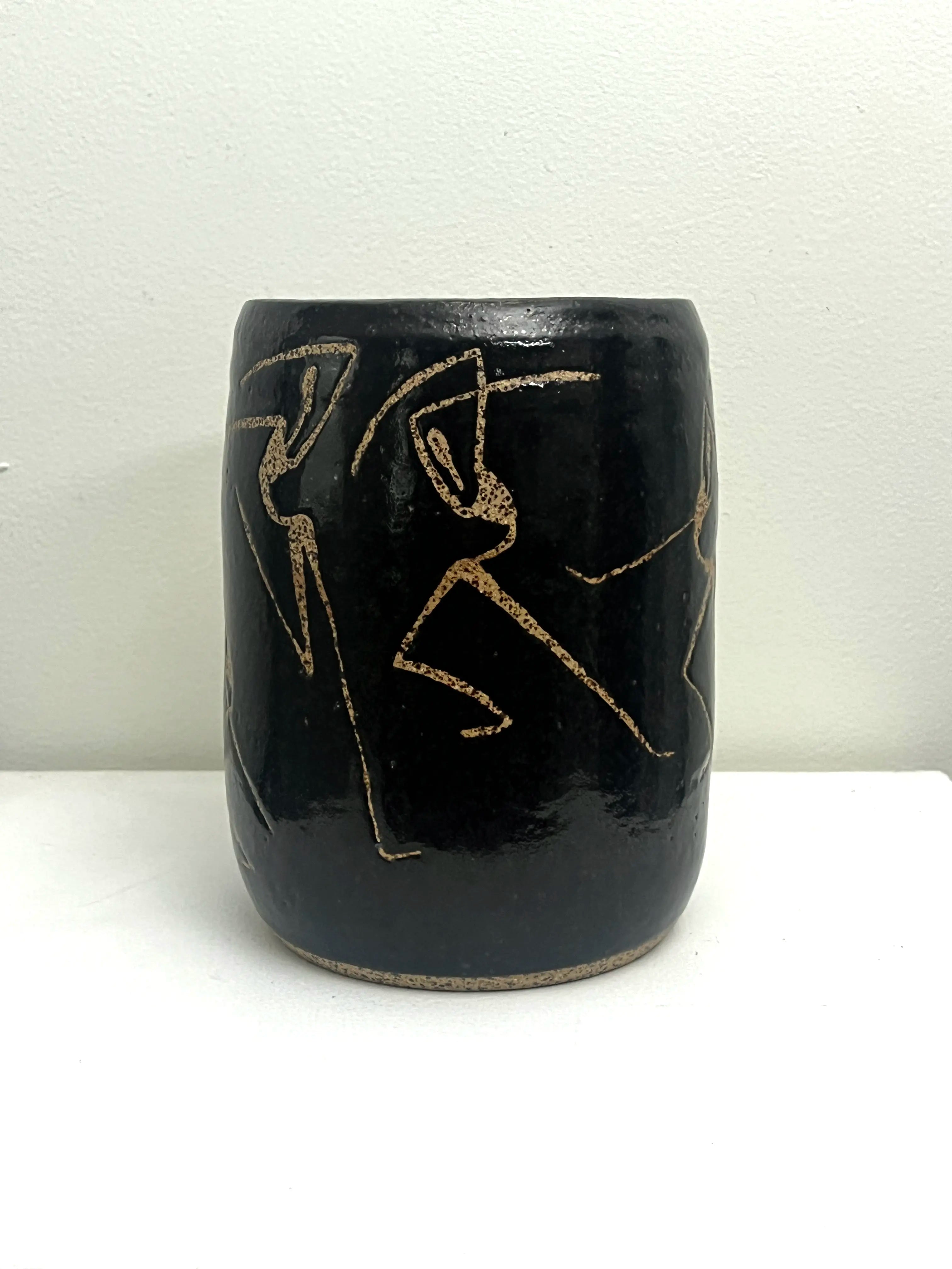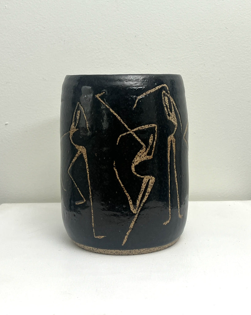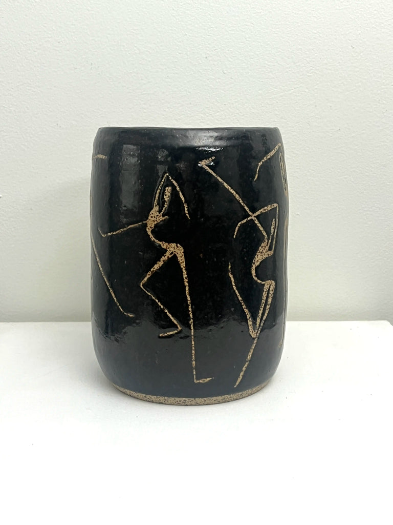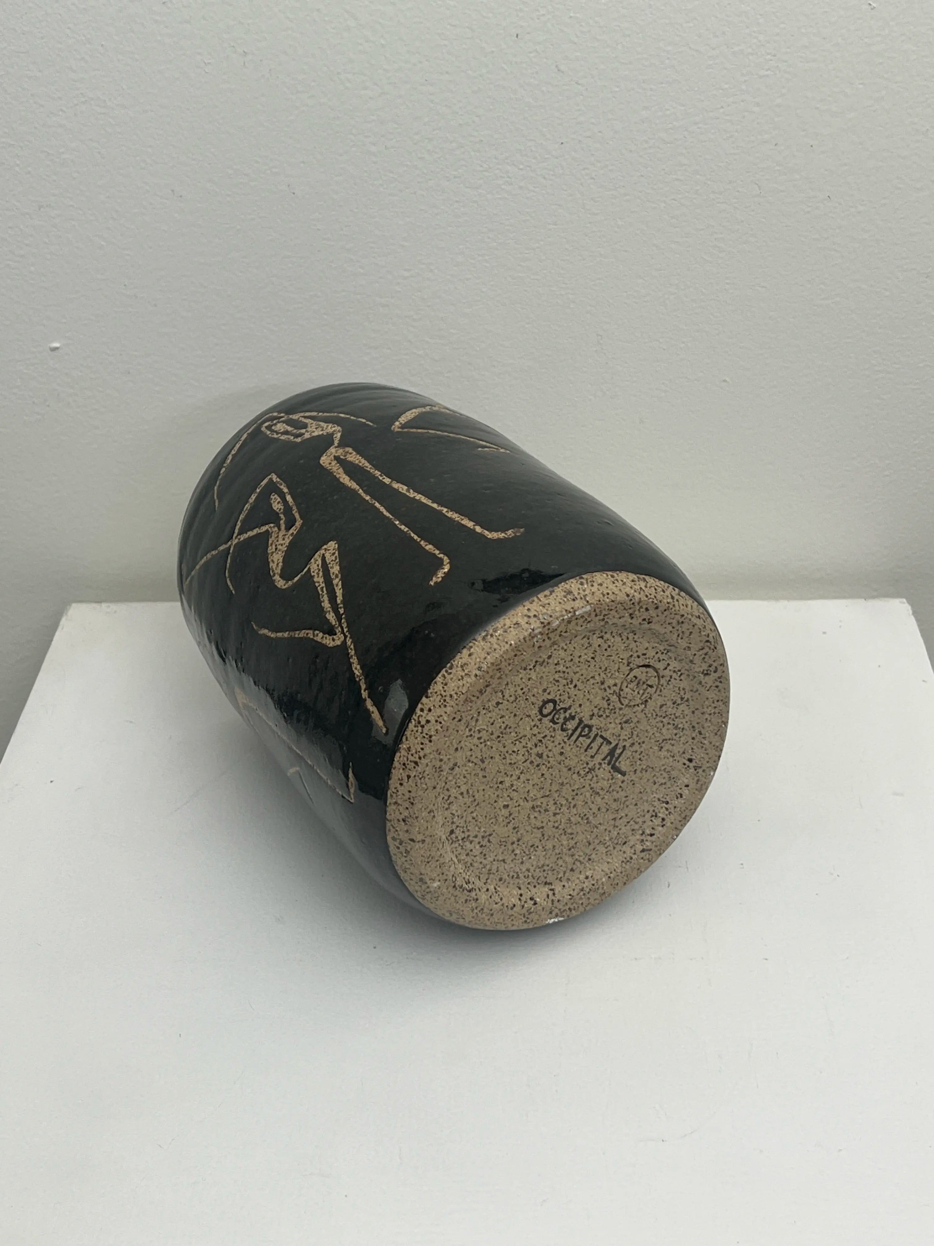 This handmade vase was created by Paula of PMT Pottery, a talented local artist, and then hand-painted by me, Occipital. I used wax to form the figure on the vase before it was glazed, adding texture and revealing the speckled clay beneath.