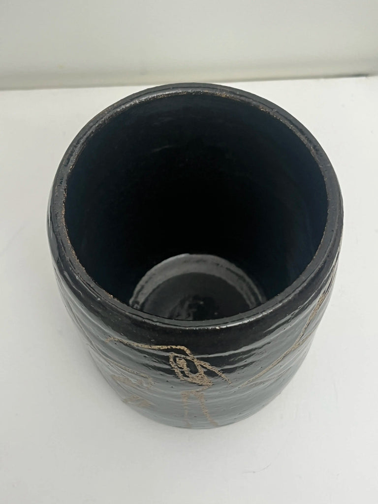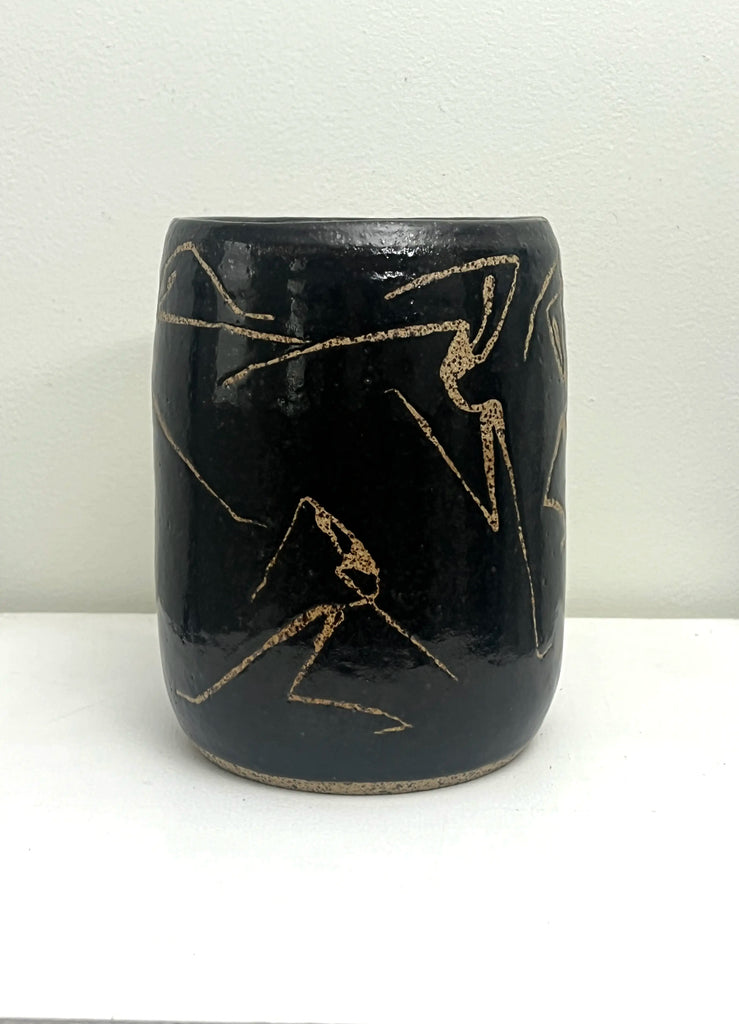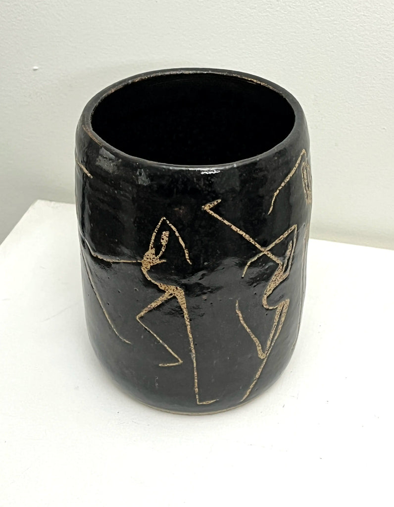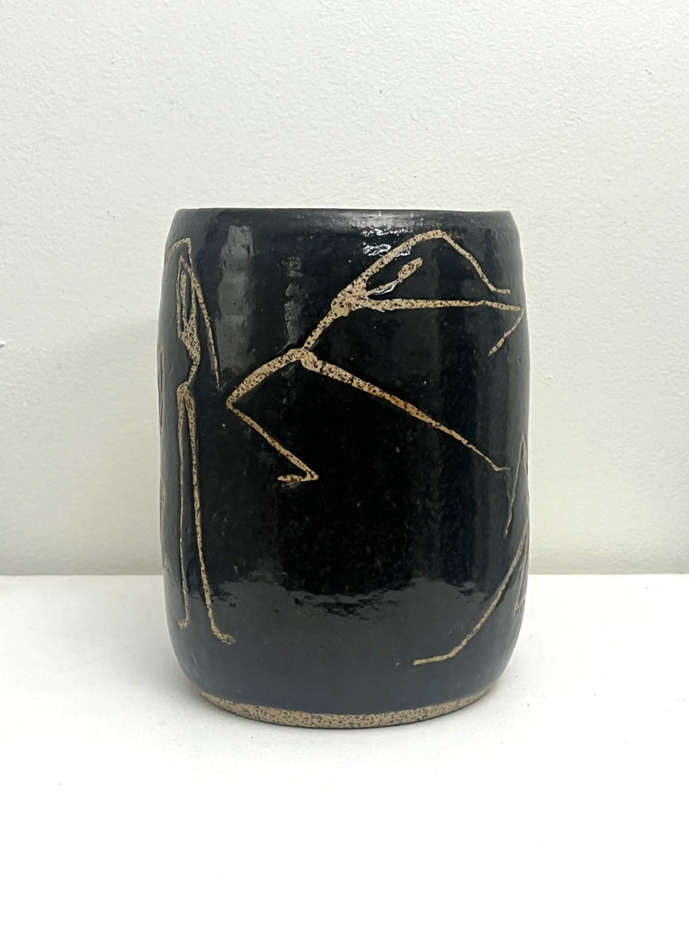 This handmade vase was created by Paula of PMT Pottery, a talented local artist, and then hand-painted by me, Occipital. I used wax to form the figure on the vase before it was glazed, adding texture and revealing the speckled clay beneath.